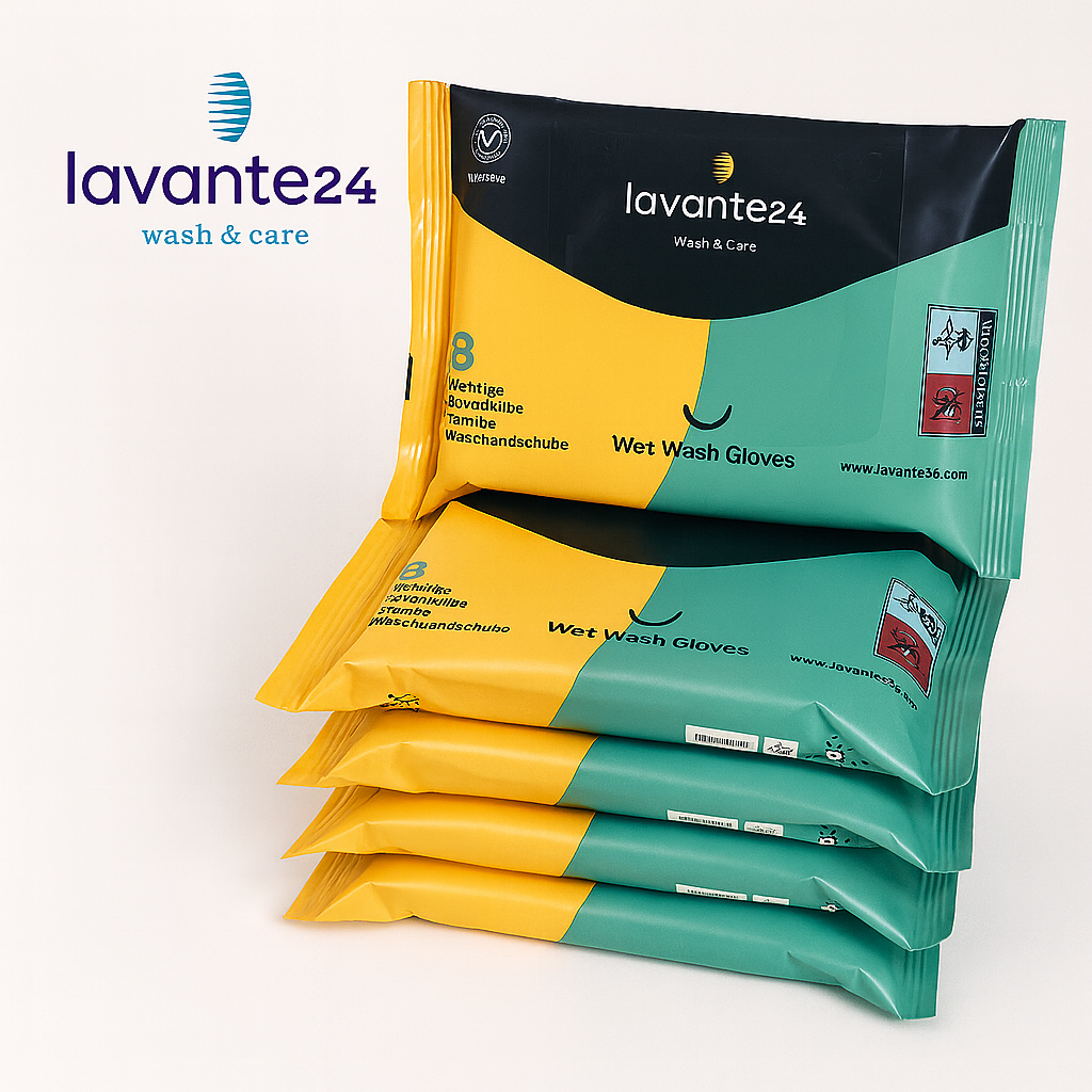 Die Lavante24 Einmal-Waschhandschuhe sind für die Körperreinigung in der Alten-, Kranken- und Patientenpflege ohne Wasser und reduzieren das Risiko von Bakterienübertragungen.